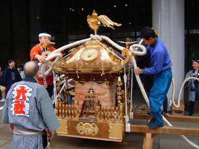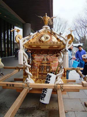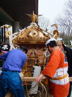 仕度の済んだ神輿。地面が濡れているのはロップを水で締めたため。