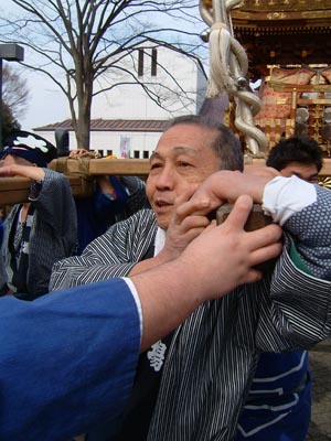 今日は梅祭りの一環として、修復された旧御本社神輿を担ぐ。
