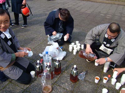 矢島家宅の前で一休み。お酒の準備。