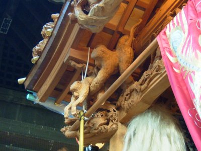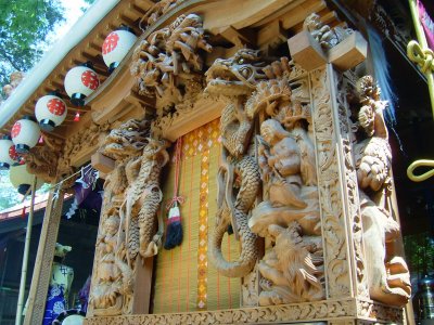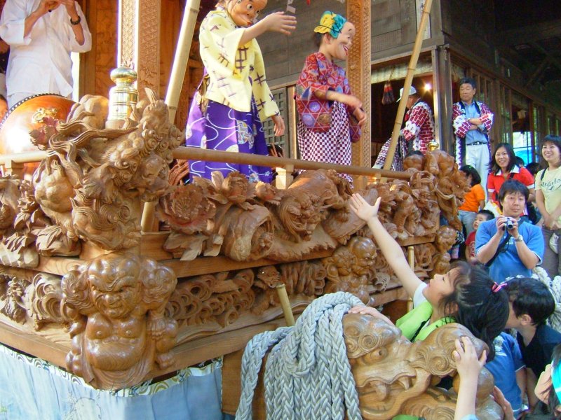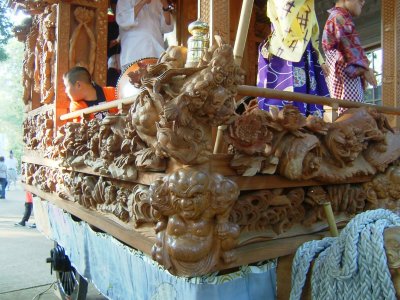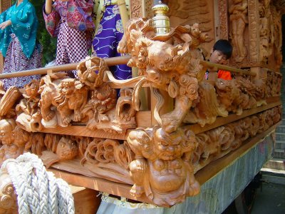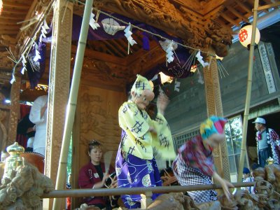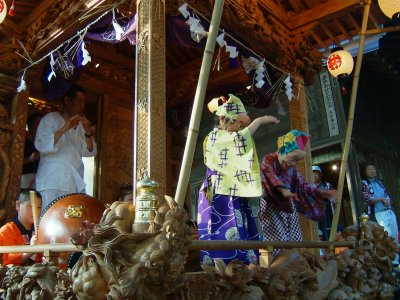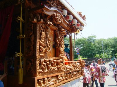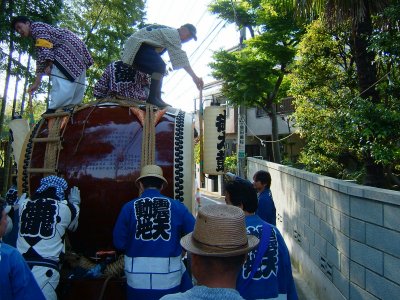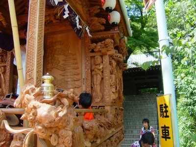 さて、急な坂を下り、神社の石段前で神輿発御を待つ山車。