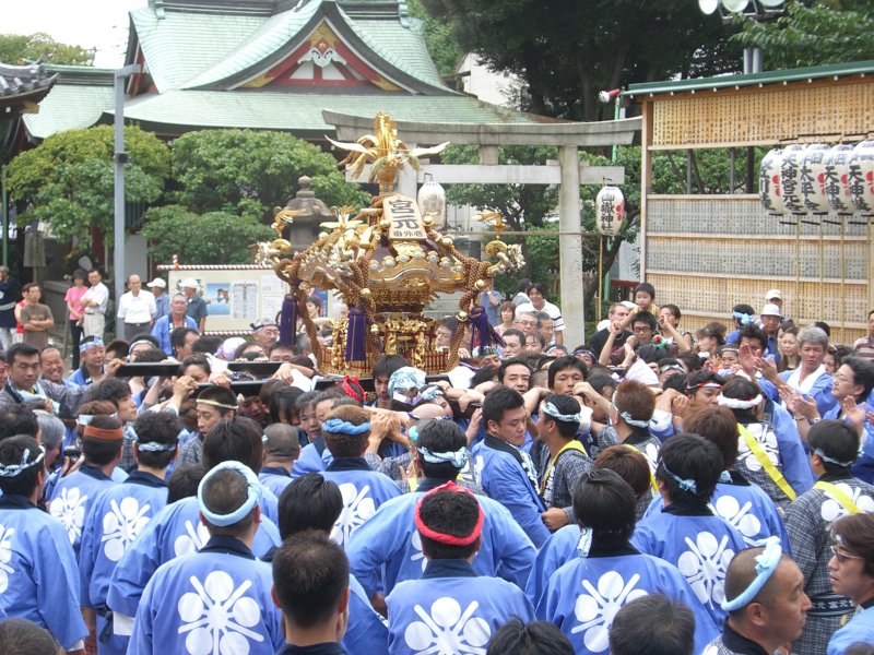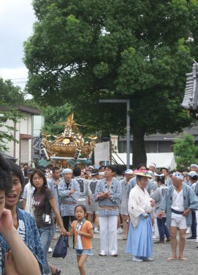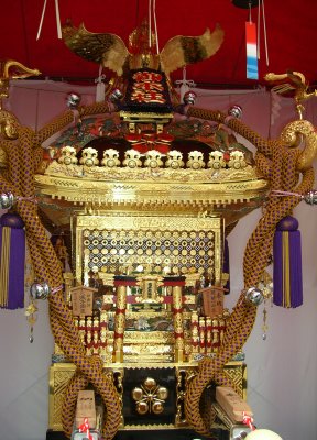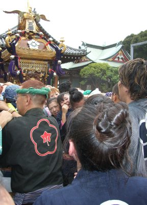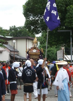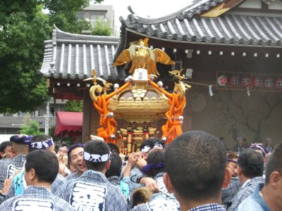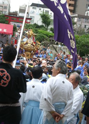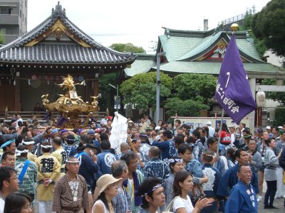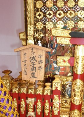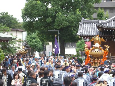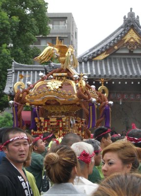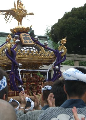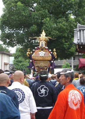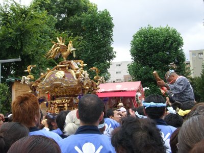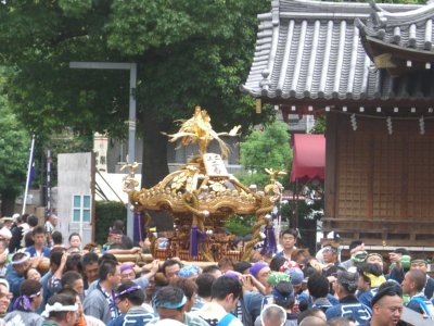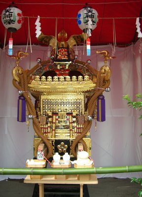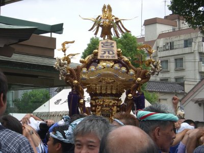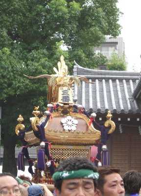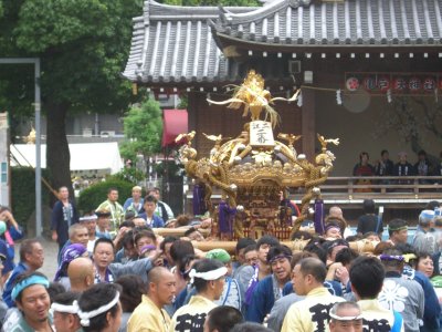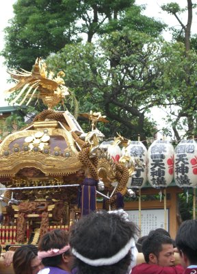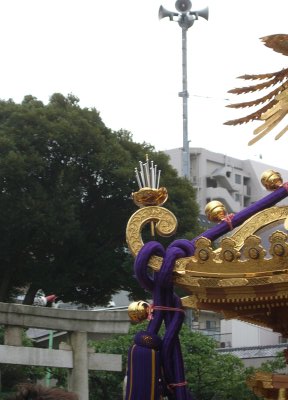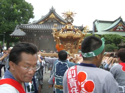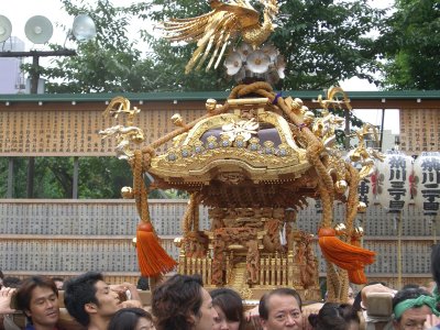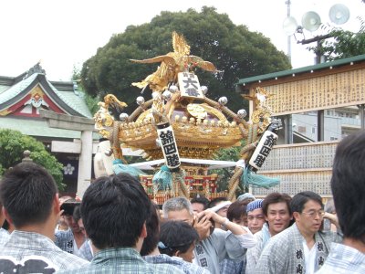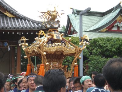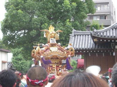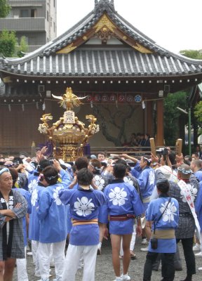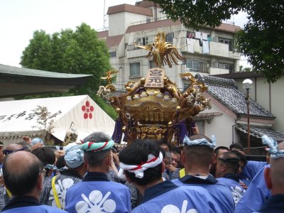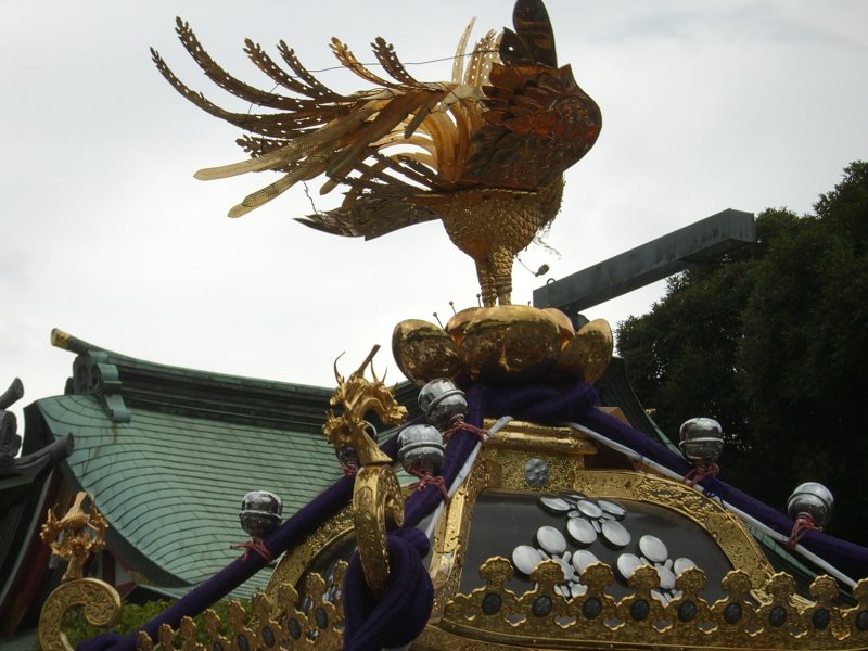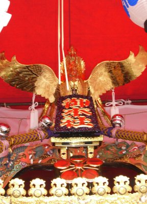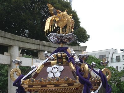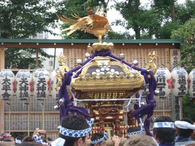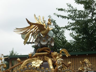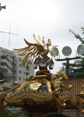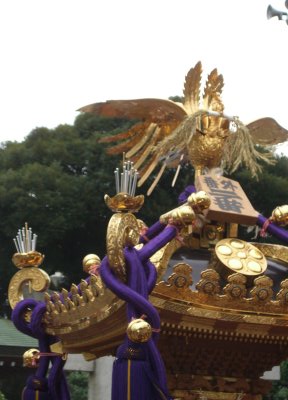 また御写真を頂きました。ありがとうございます。 今回は亀戸天神の祭礼の写真を頂きました。 写真に写っている本社神輿は新しいですね。 筆者の手元にある写真は、鳳凰の代わりに梅鉢がついています。 |