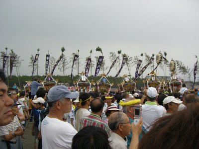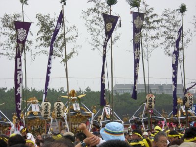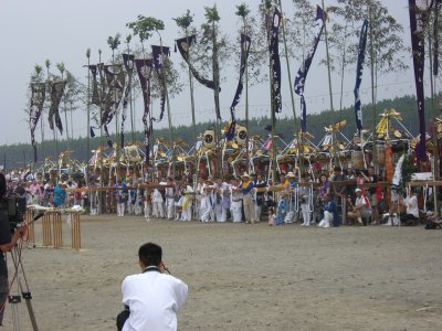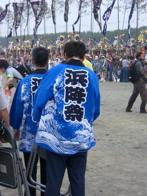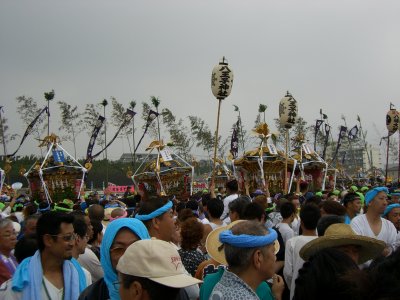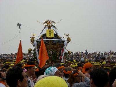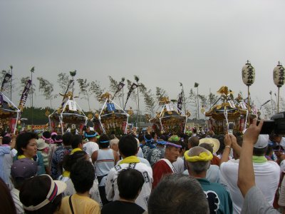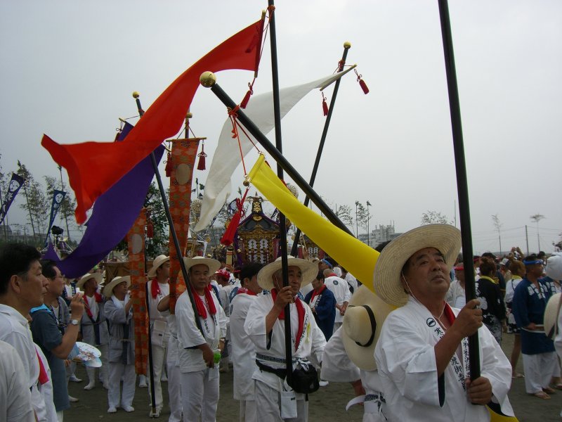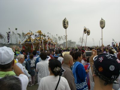 始まりは諸説あるようですが、面白いのは以下の説です。 天保9年に相模一之宮である寒川神社の神輿が、5月5日に行われる国府祭(こうのまち)の帰り。 相模川の渡し場で寒川神社の氏子と土地の神社の氏子が争って、神輿が川に落ちて流されてしまったとか。 数日して、南湖で網元の孫七という方が、漁の最中に神体を発見して寒川神社に届けたそうです。 その後、寒川神社の神輿が南湖の浜で禊ぎをするようになったのが始まり。 というのがその説です。 今回も、のぶさんが写真を届けてくださいました。 コメントは筆者です。 |