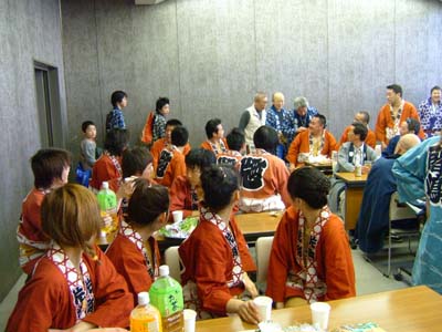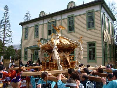 郷土の森の二階展示室から神輿を出し、博物館前にて準備をする。
