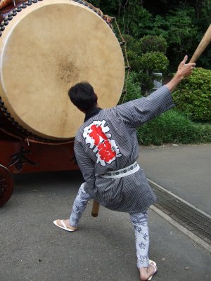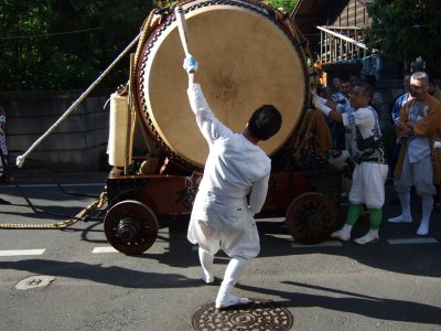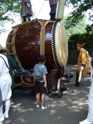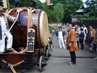 神輿が出てくるまで、太鼓と山車は鳥居前で待つ。