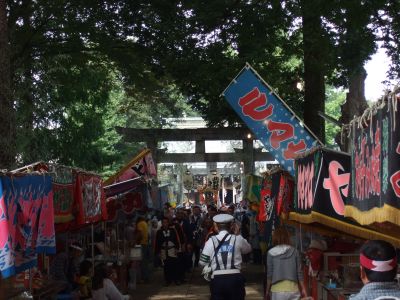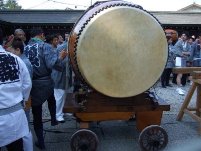 太鼓を曳くのも今はトラクターだが、元来は人力、一時は牛で曳いたそうで、牛には紅白の幕を掛けて曳かせたとのこと。