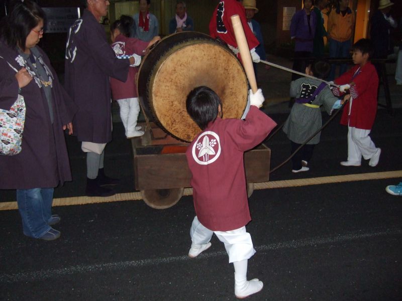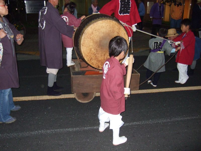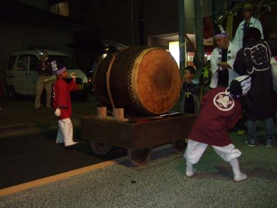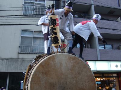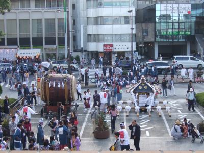 駅前で休む太鼓と神輿。