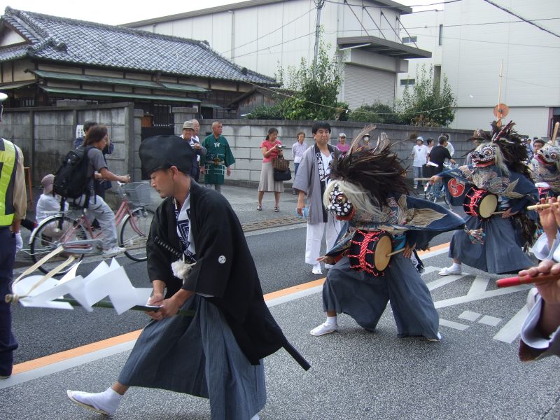 花笠の後に獅子を先導する平串持ち。そして獅子が三匹。