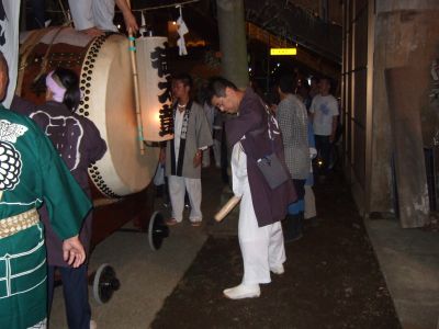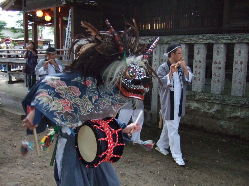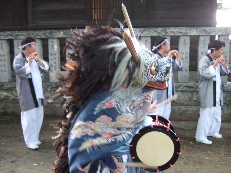 いったん神社に戻った太鼓。獅子が入ってくるのを待ちます。
