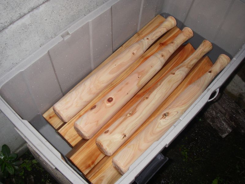 太鼓撥を削る様子。水に漬けてるのは割れを防ぐためです。