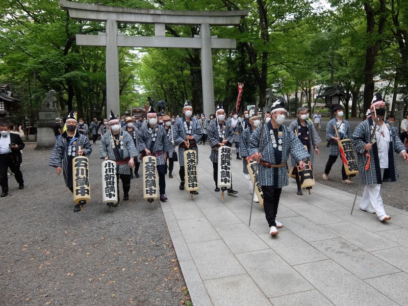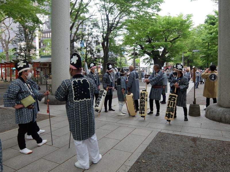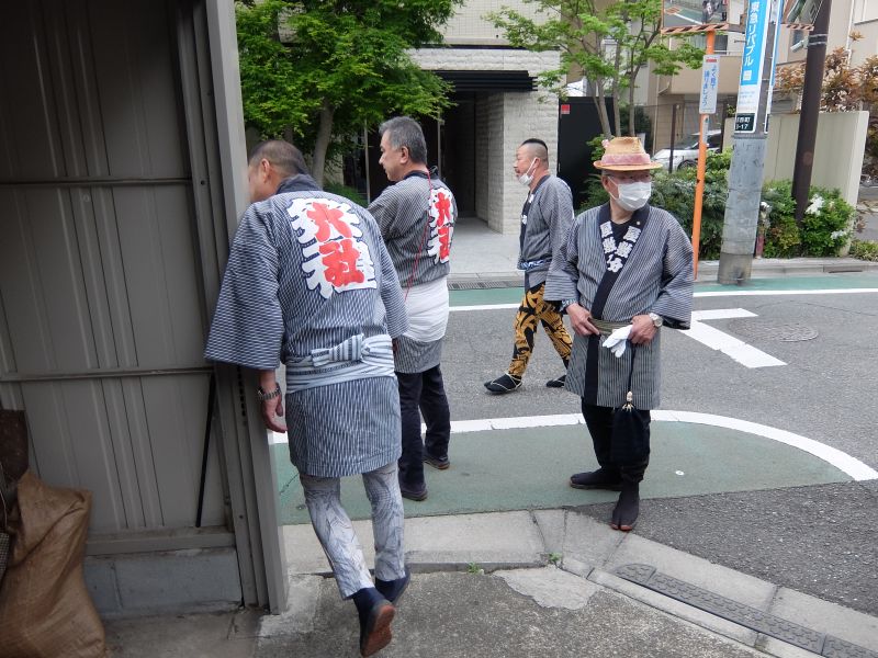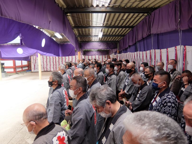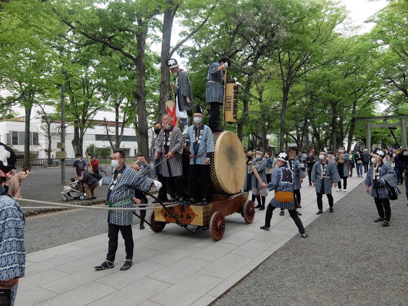 山車を引き連れて迎えて、桃色の揃いの手ぬぐい。