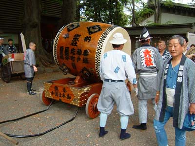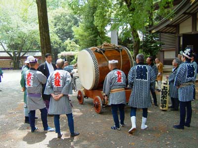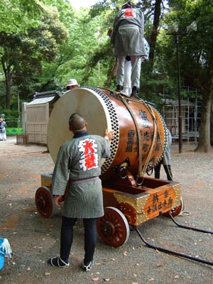 太皷を吊って台車に乗せ変え、外に出す。