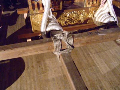 郷土の森に展示されている神輿に天棒を入れる。