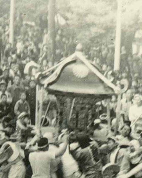 製作:明治33年 大工は神戸の西山重吉。経費は523円50銭1厘。 改修前の姿。神輿そのものは現在の神輿と同じである。 改修前の一之宮同様、彫り物など入っていないシンプルな姿であることがわかる。 屋根の形は現在も同様で、六之宮との違いのわかるポイント。 これ以前の神輿は、四之宮との大喧嘩がおきて、鉈や鉞で叩き壊されたという。 その後は大勢の人間が破壊された神輿の部材を持ち帰ったようだ。 その部材の一部で、壊された神輿の胴は井戸枠に使われていたというが、井戸もいつの間にか姿を消してしまい行方不明になったという。 |