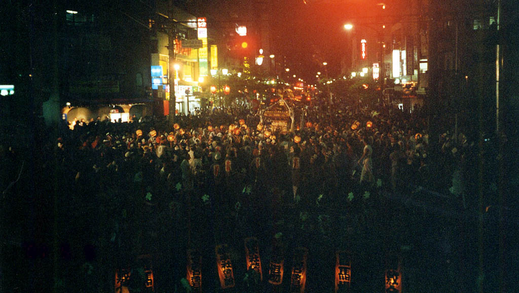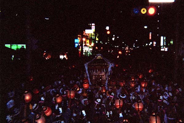 手丸提灯が揺れる。ホイサホイサの掛け声も高らかに神輿は進む。