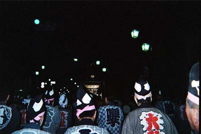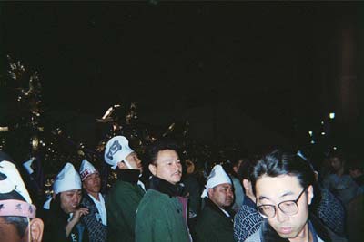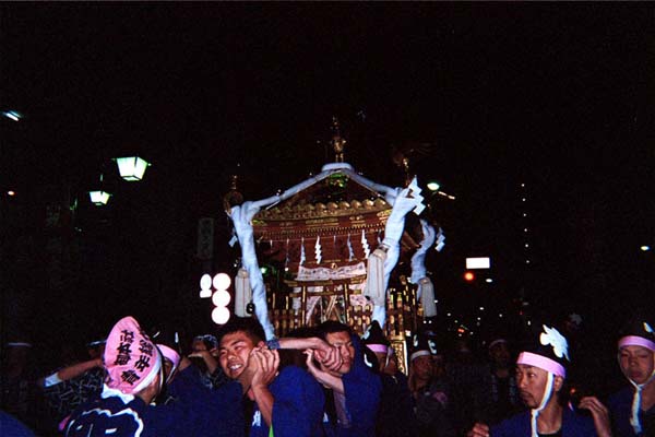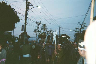番場会所前の一之宮。番場の会所に着く頃には、夜が明けきる。この頃みんな疲れのためか、神輿の担ぎ棒にもあきがある。