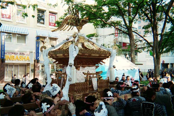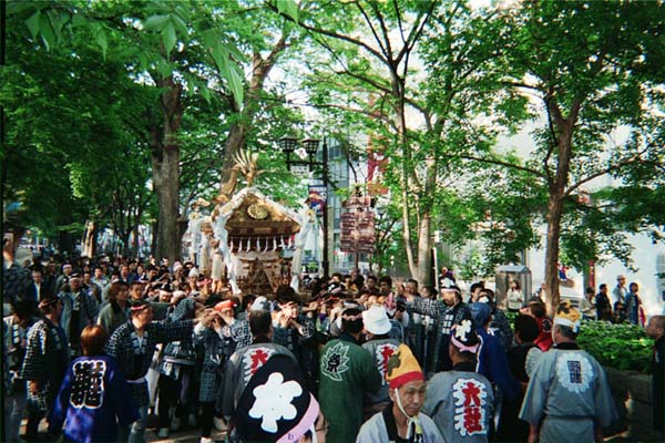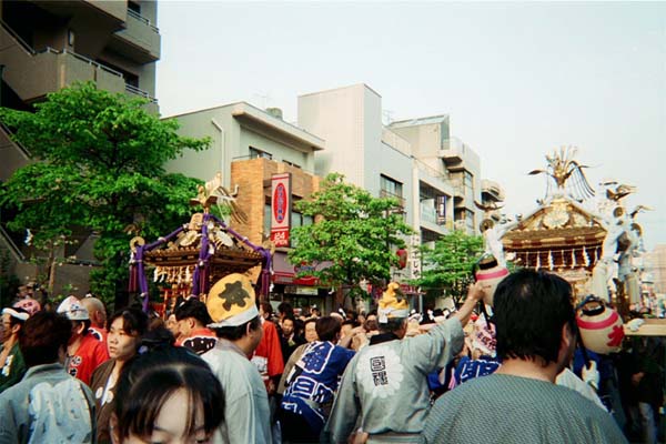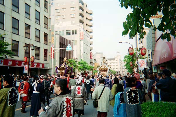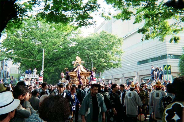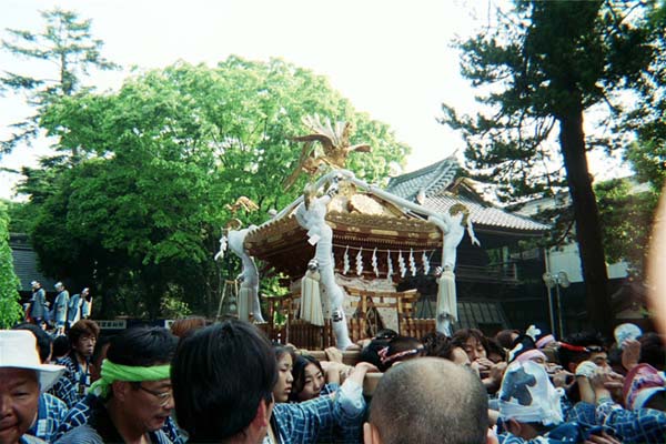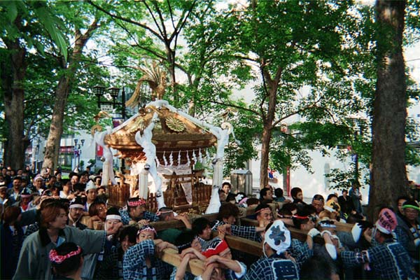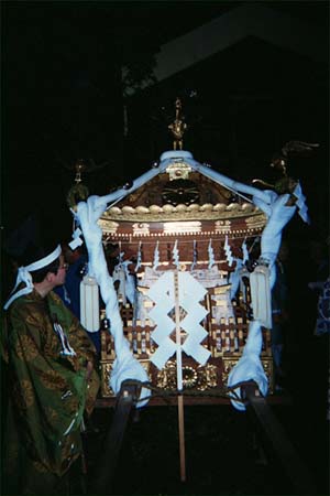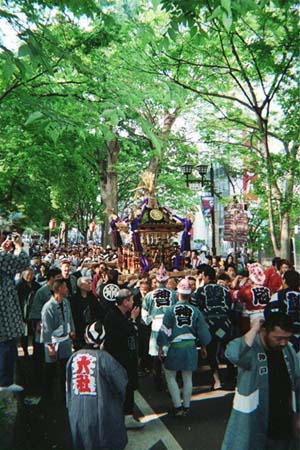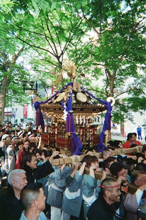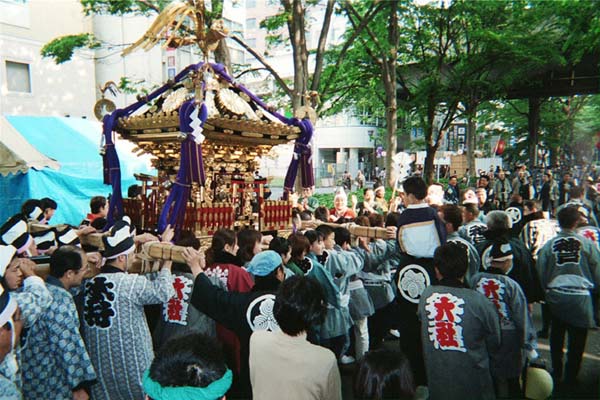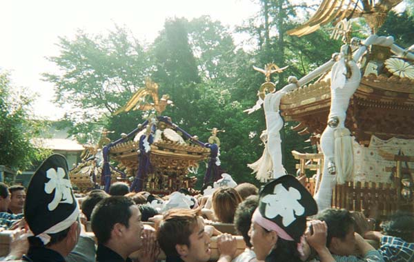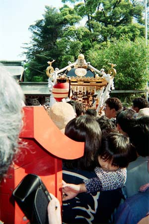 太鼓は神社の前までは神輿を先導し、神社の前で神輿の後ろにつく。