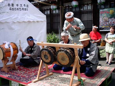 潮盛講会所脇にて、昔の番場青年が囃子を演奏。年季が入っているだけあって上手である。