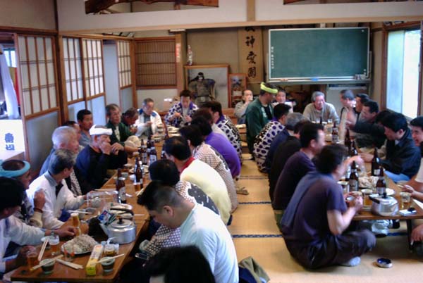 飾り付けも終わり、太鼓を納めた後で番場公会堂にて昼食。