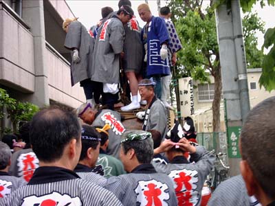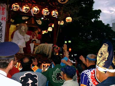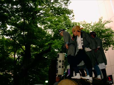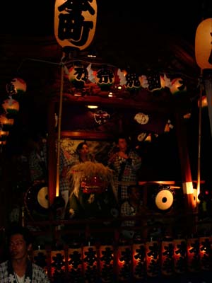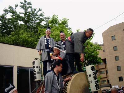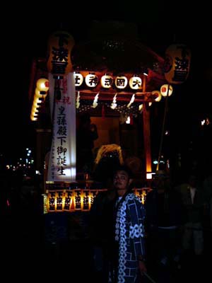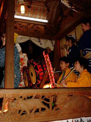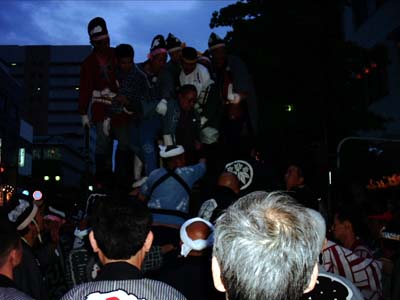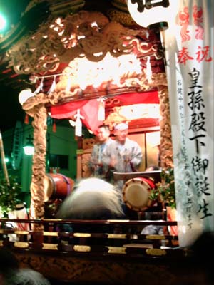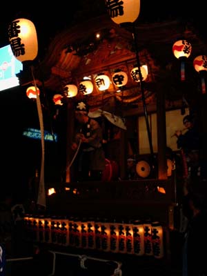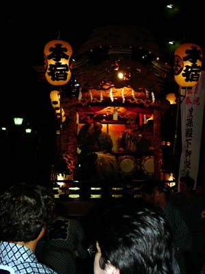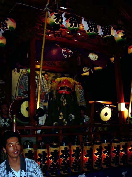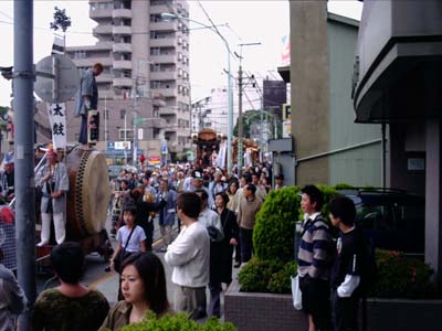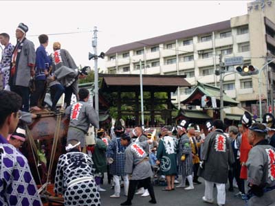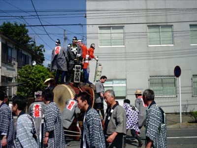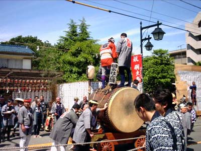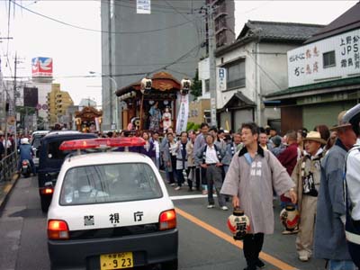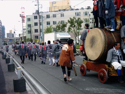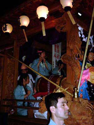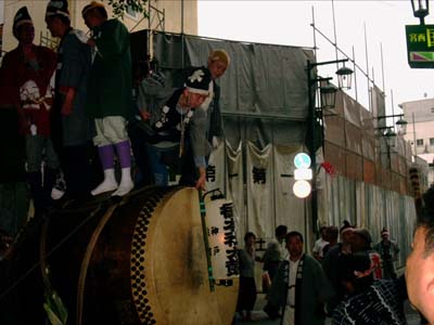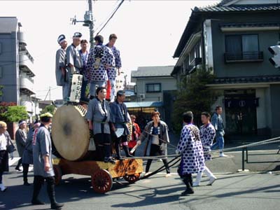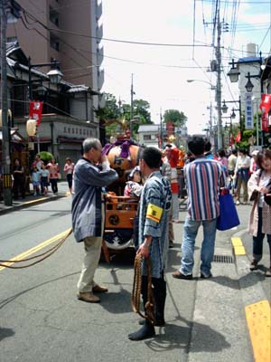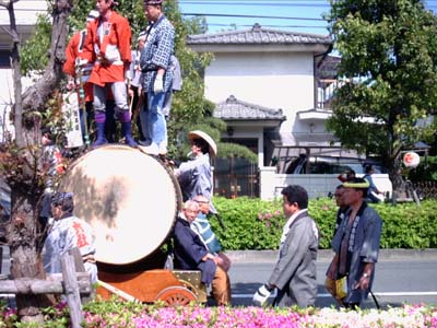 山車のパレードに参加の屋敷分。パレードがとぎれるのを待つ御本社太鼓。