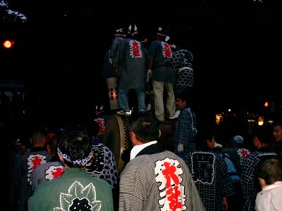 太鼓に頭を向けた片町の山車。ホイサホイサのかけ声が起き、大いに盛り上がる。