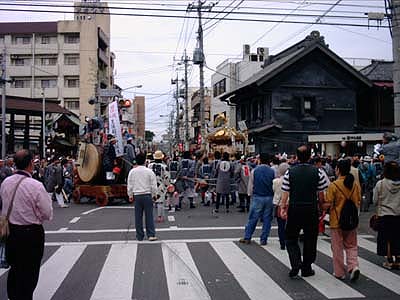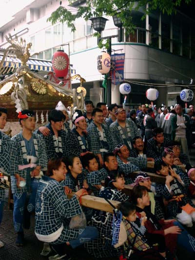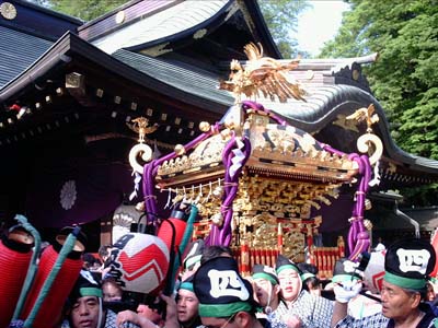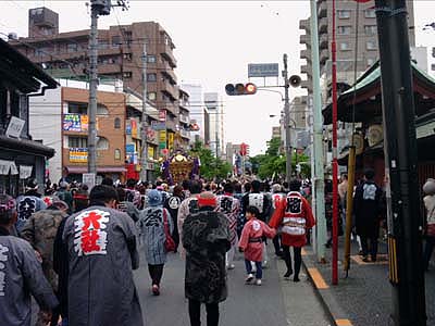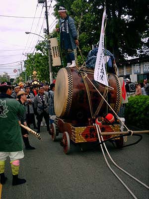 太鼓の脇を御本社の神輿が番場三丁目へ抜けてゆく。