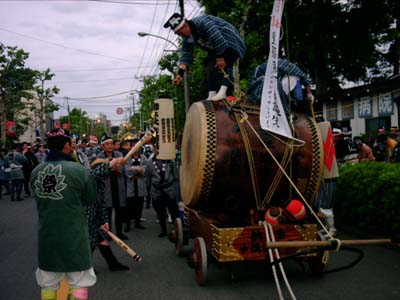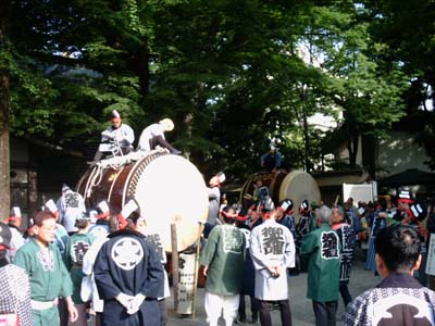 休日の朝だ、このころには人出も増え、太鼓の廻りにギャラリーが集まる。