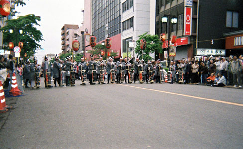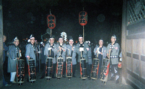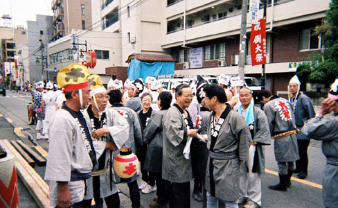 先駆を先導する警固。参道が狭いため2列になっている。