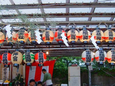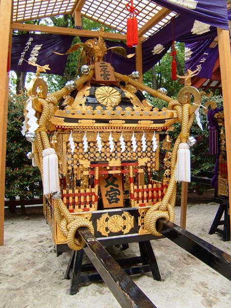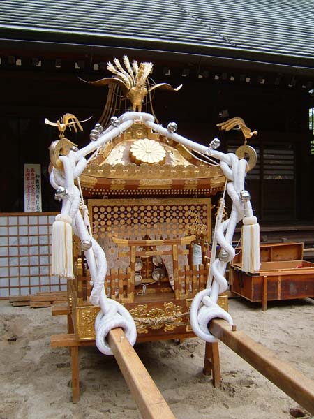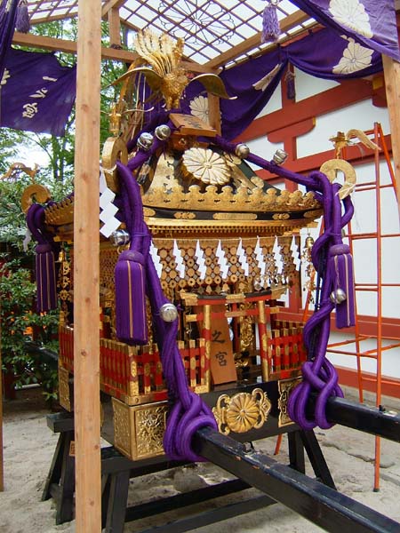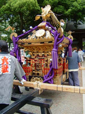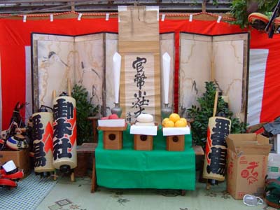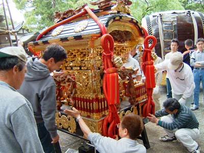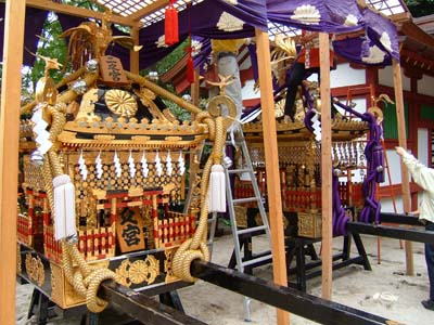 本殿前では各神輿が運び込まれ、小屋掛けが行われている。