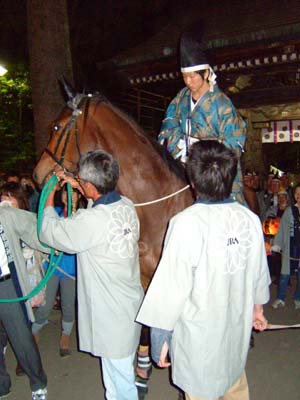 欅並木へと向かう行列。騎手は随神門を出てから馬上へ。