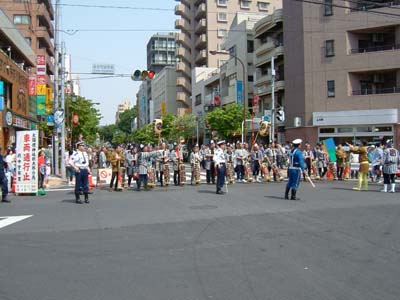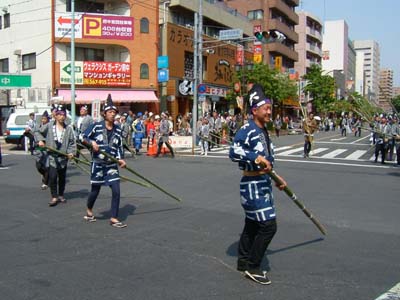 出発。先導は五ヶ町の警固が一張りずつつきます。