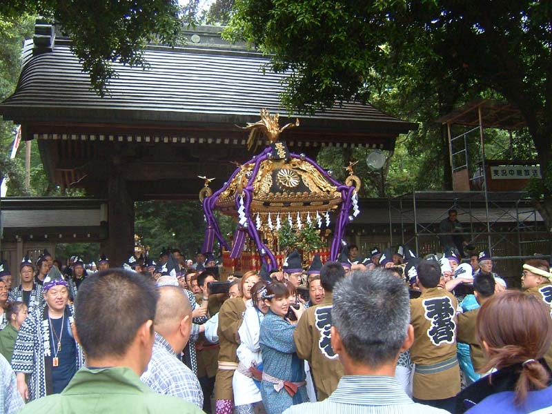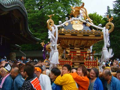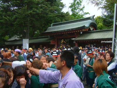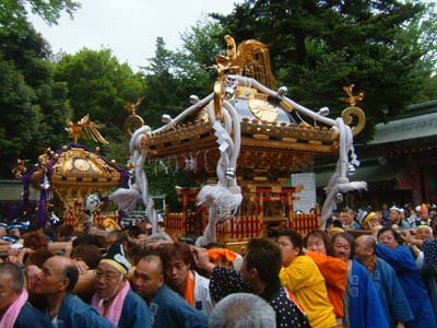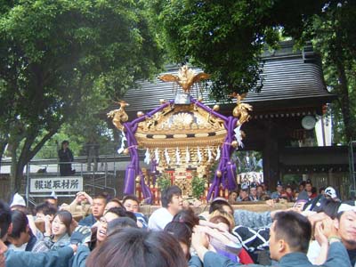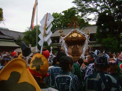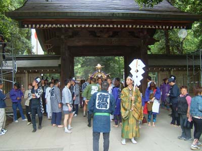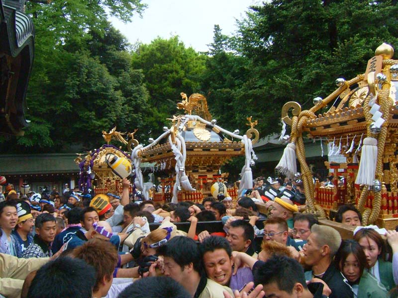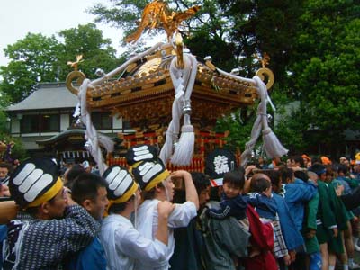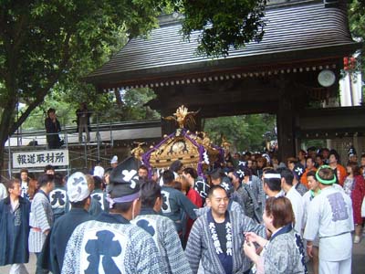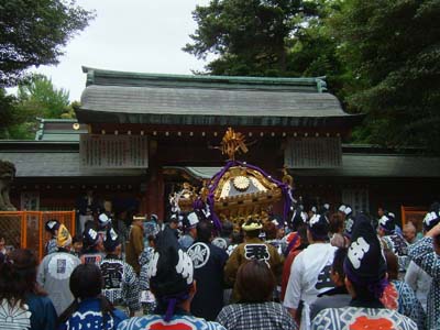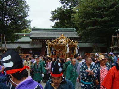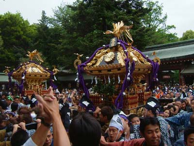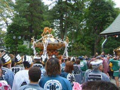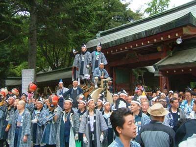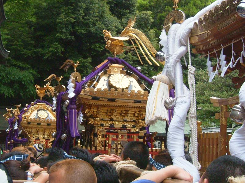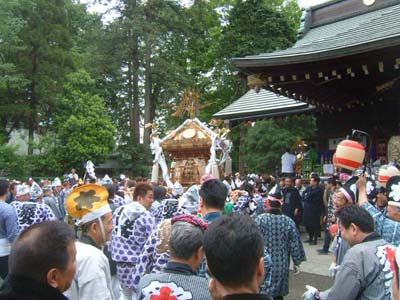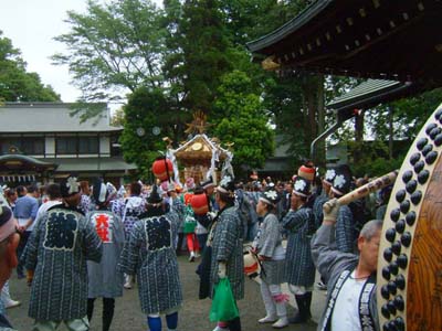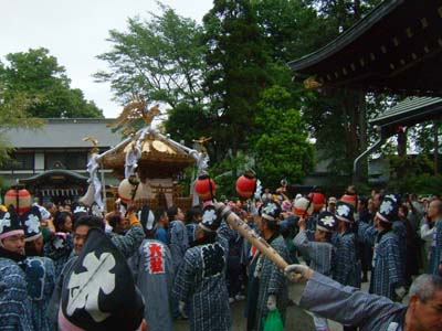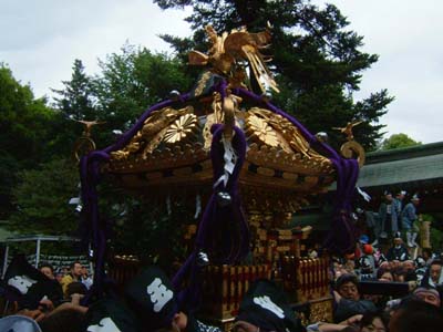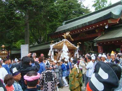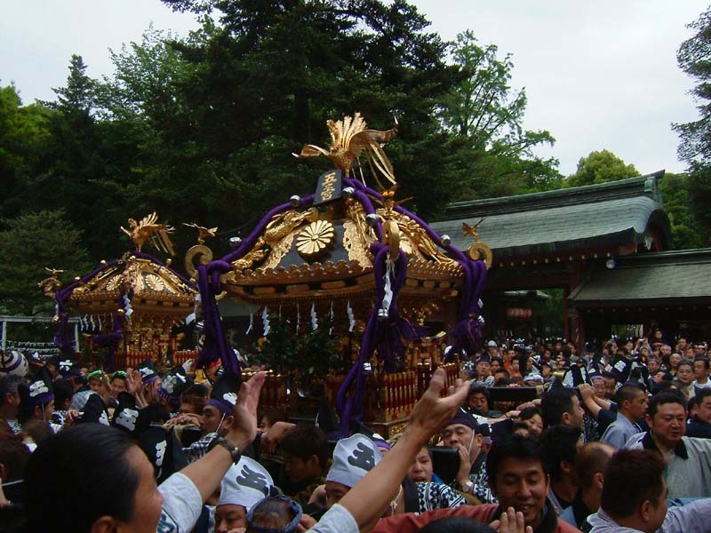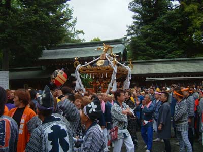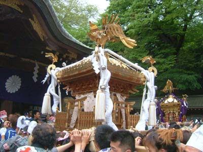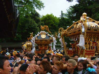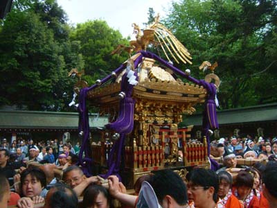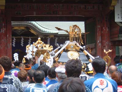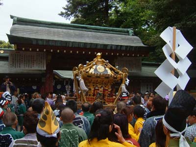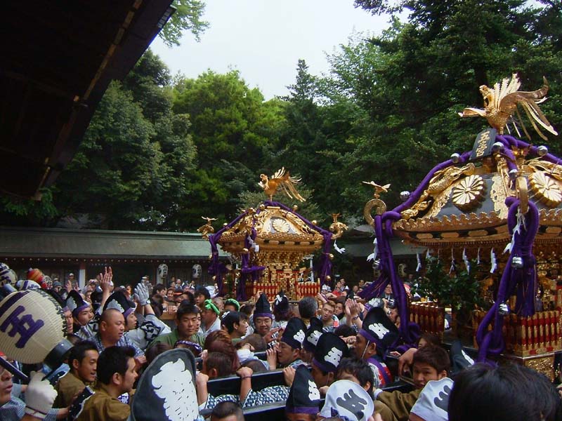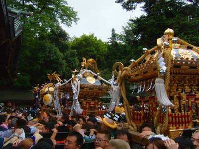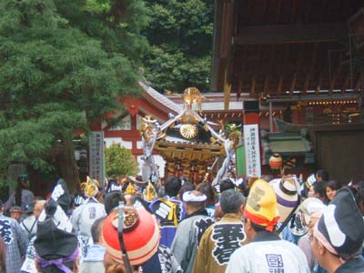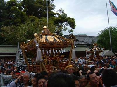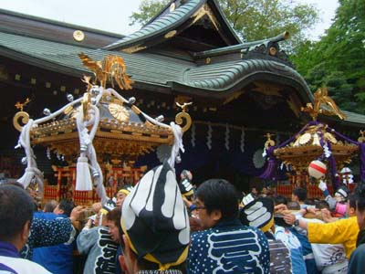 奥は六之宮。手前は三之宮。4基の神輿が拝殿前を練っている。