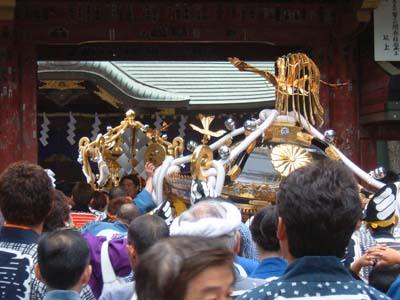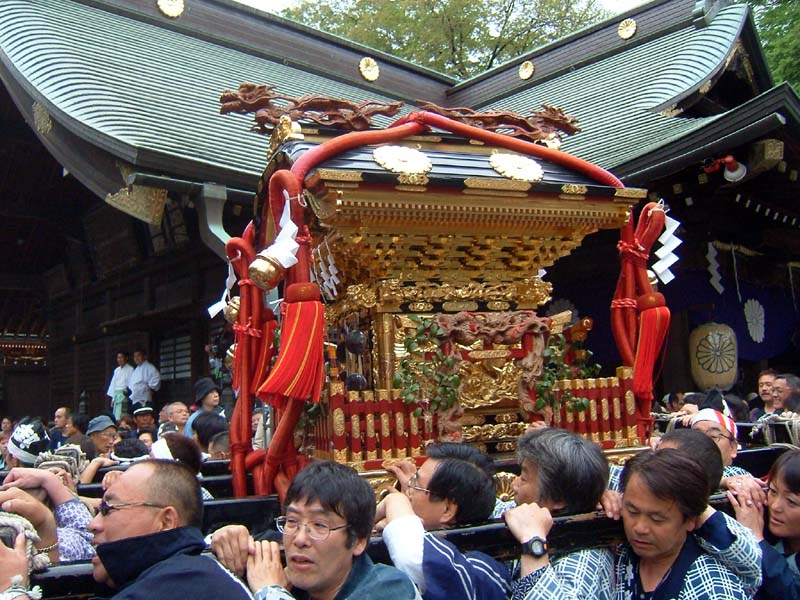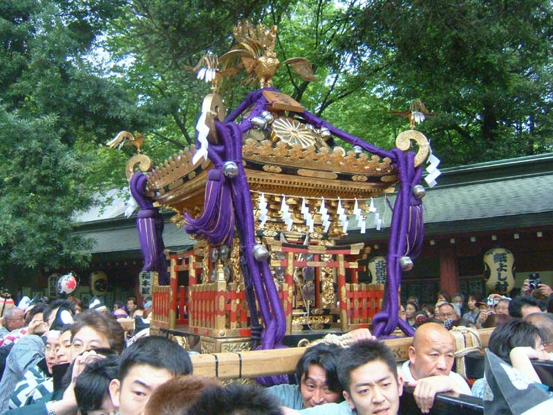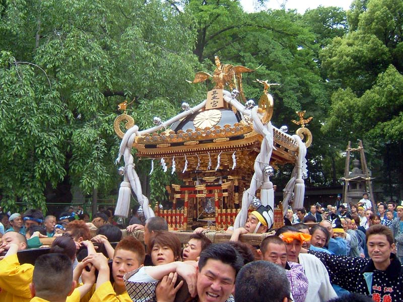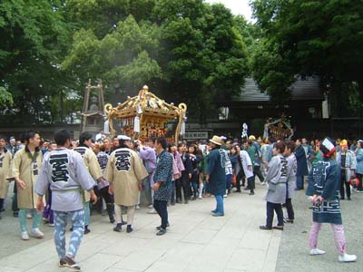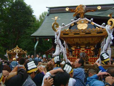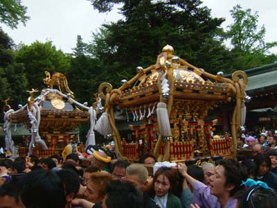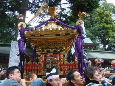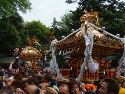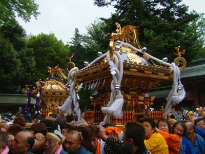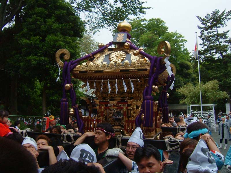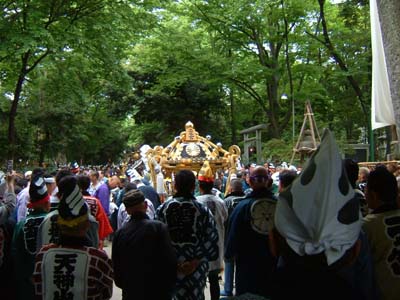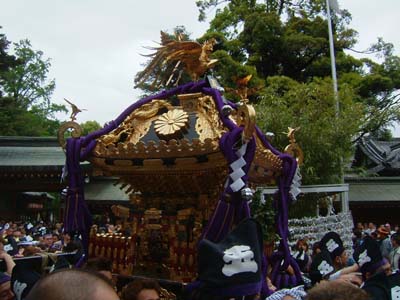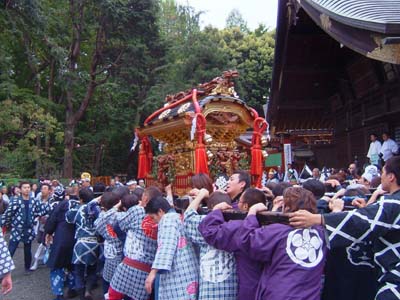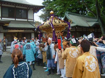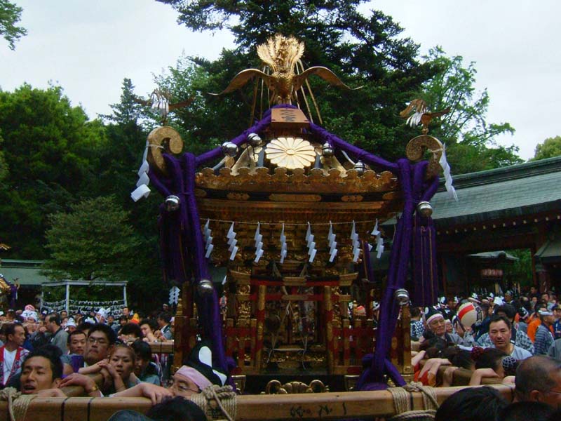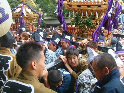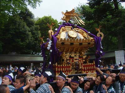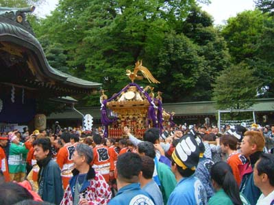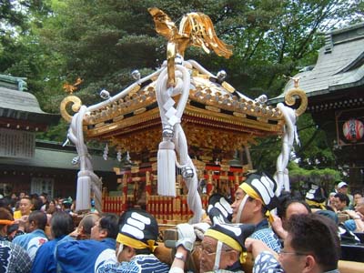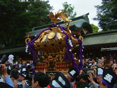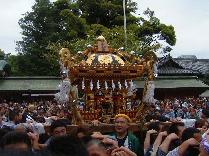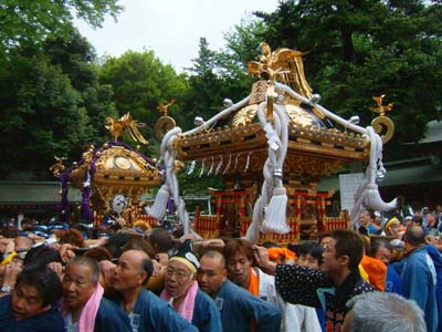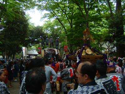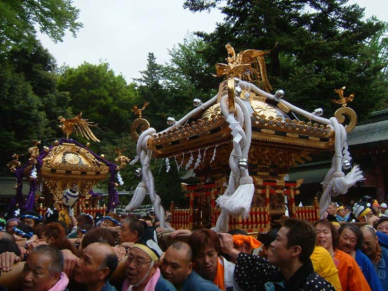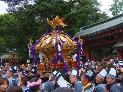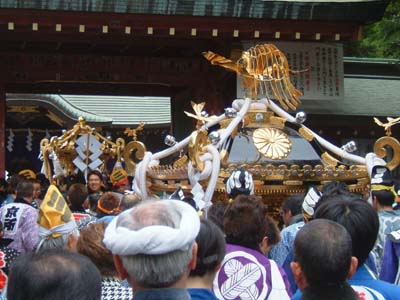 奥は六之宮。手前は三之宮。4基の神輿が拝殿前を練っている。