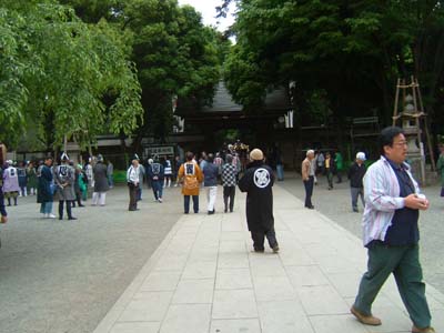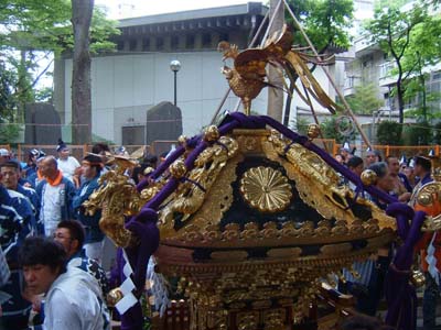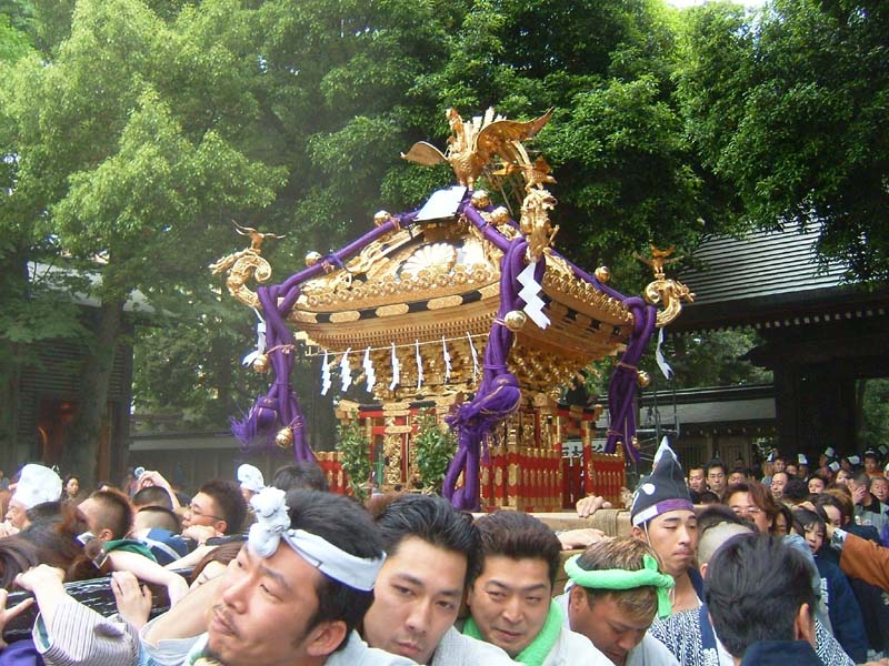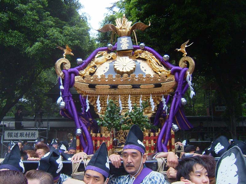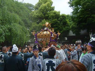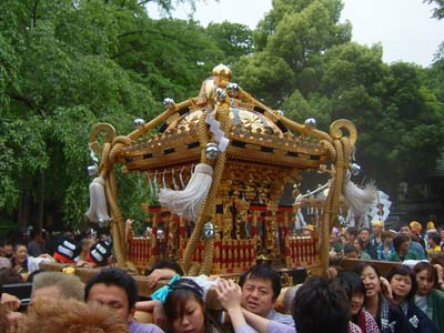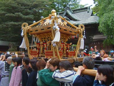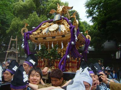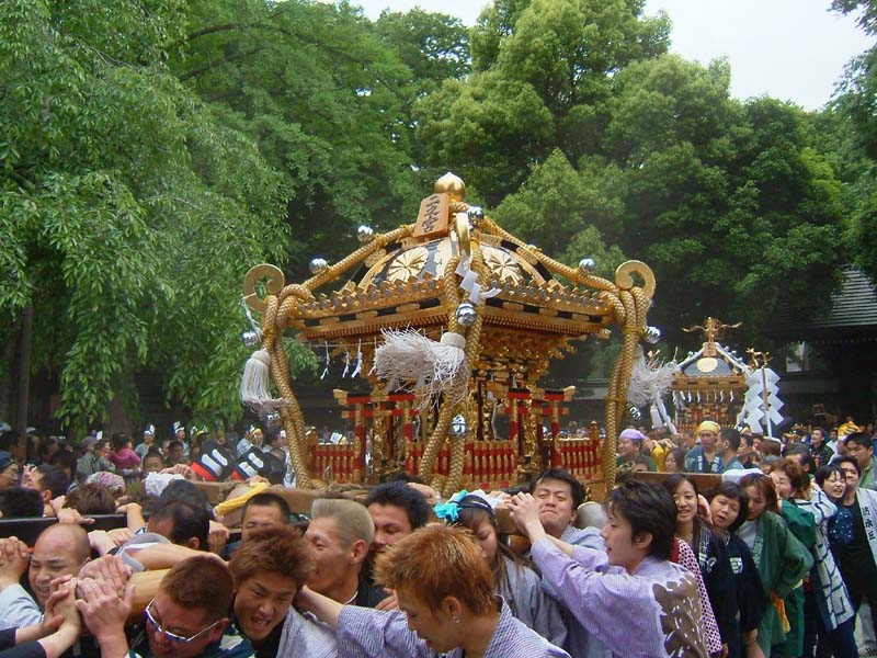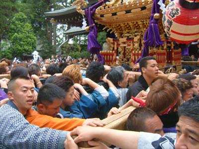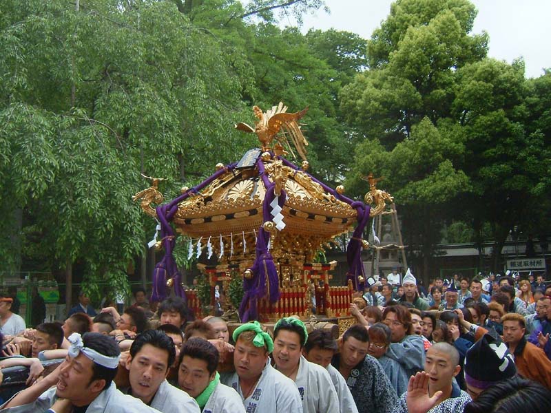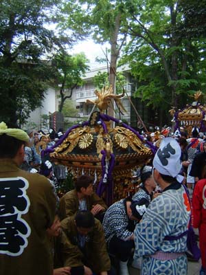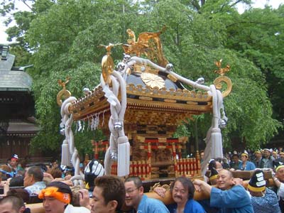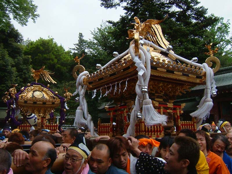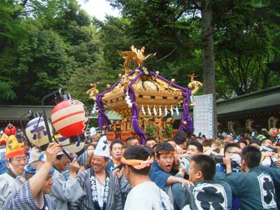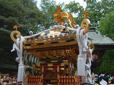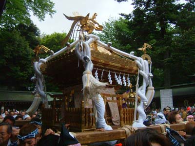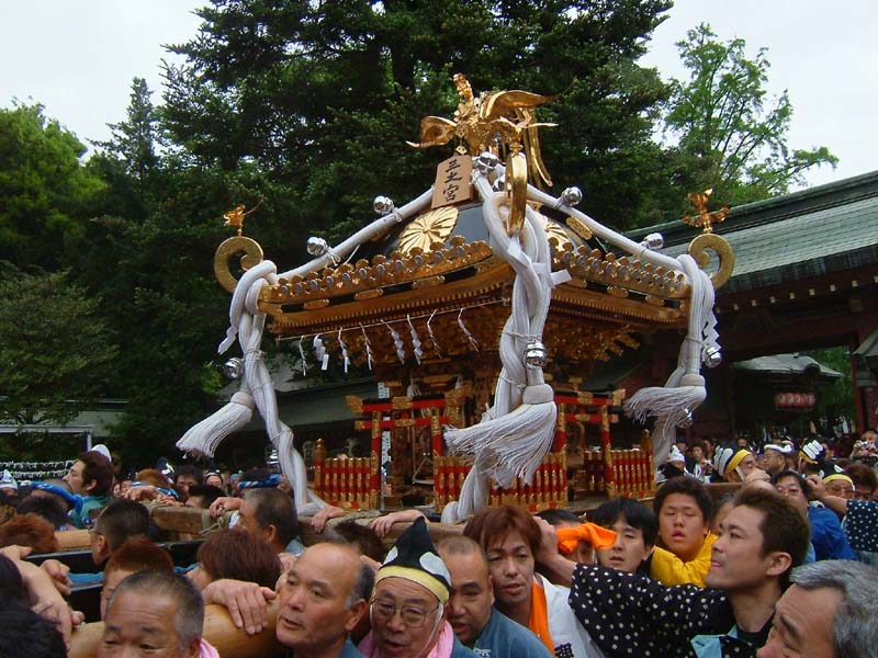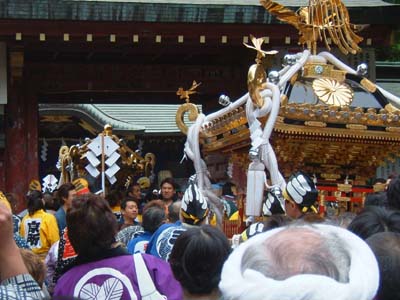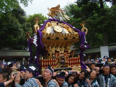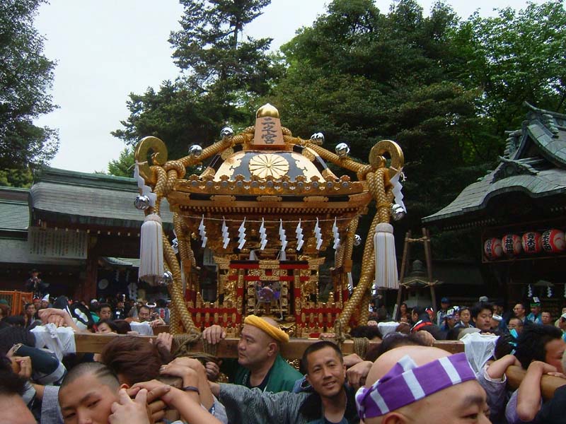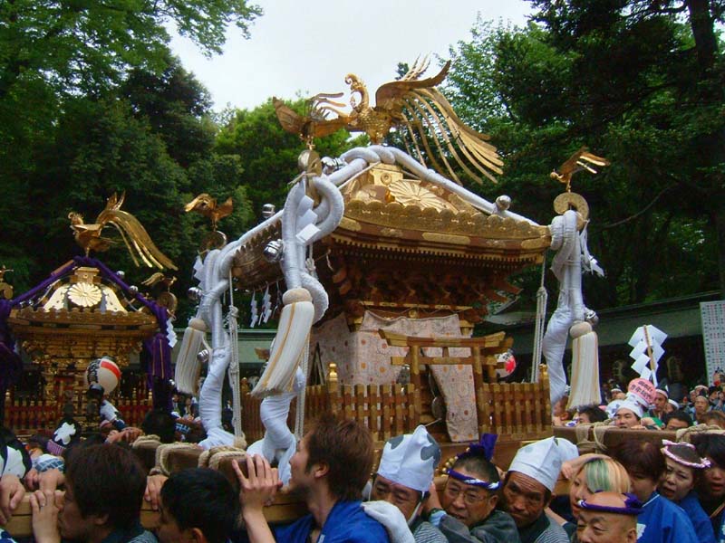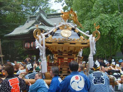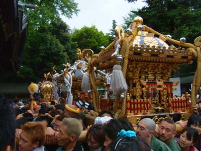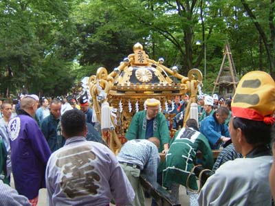 奥は六之宮。手前は三之宮。4基の神輿が拝殿前を練っている。