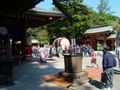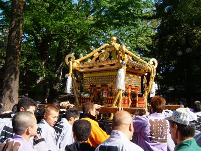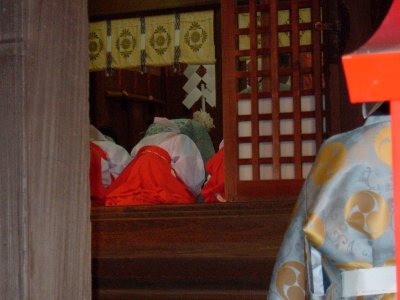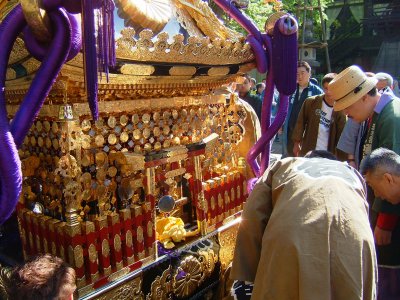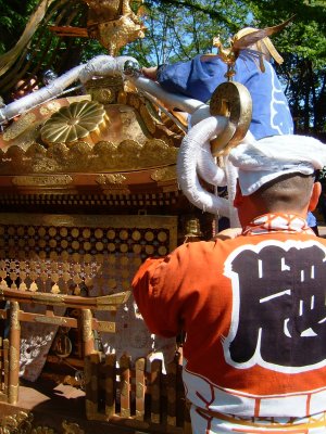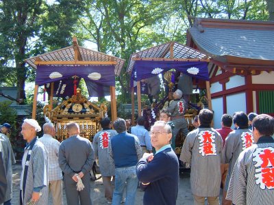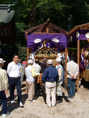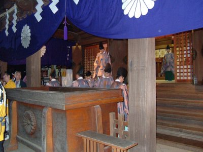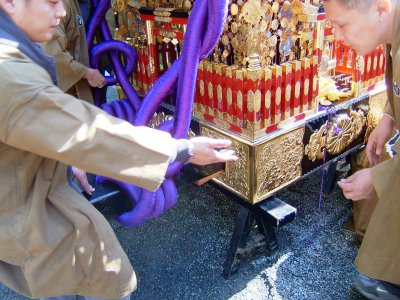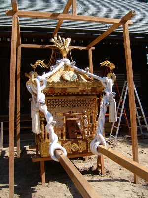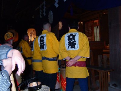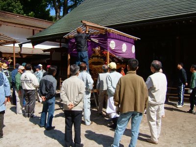 三之宮が運び込まれ、二之宮の太鼓はお祓いを受けている。