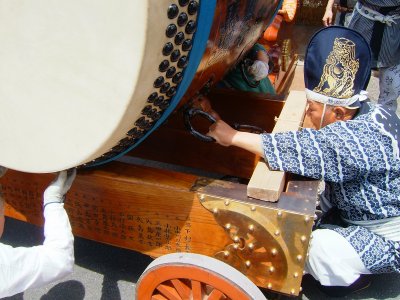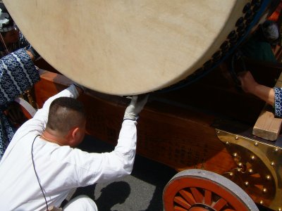 太鼓の両面と車輪、そしてバチ二は酒をかけて清める。