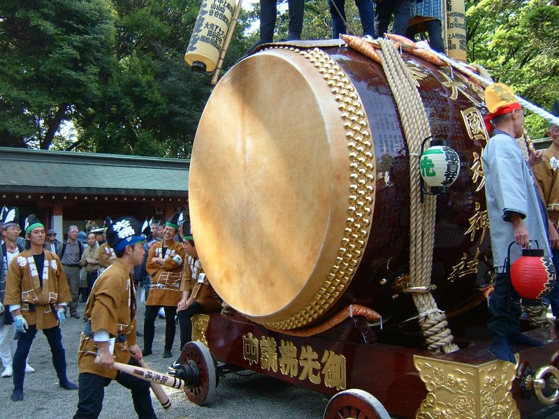 中雀門外。手前は御本社太鼓、奥は三之宮太鼓。左は二之宮太鼓。
