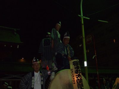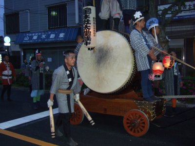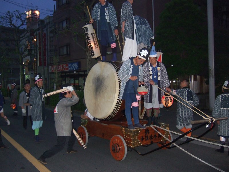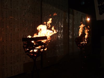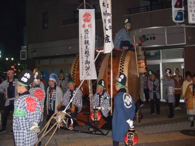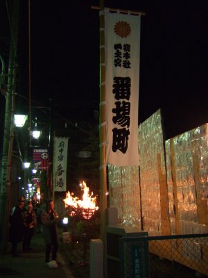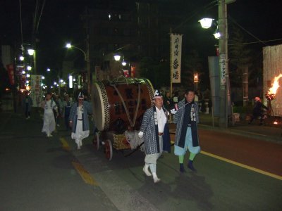 太鼓が御旅所前へ。番場公園前には篝火が焚かれている。