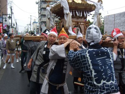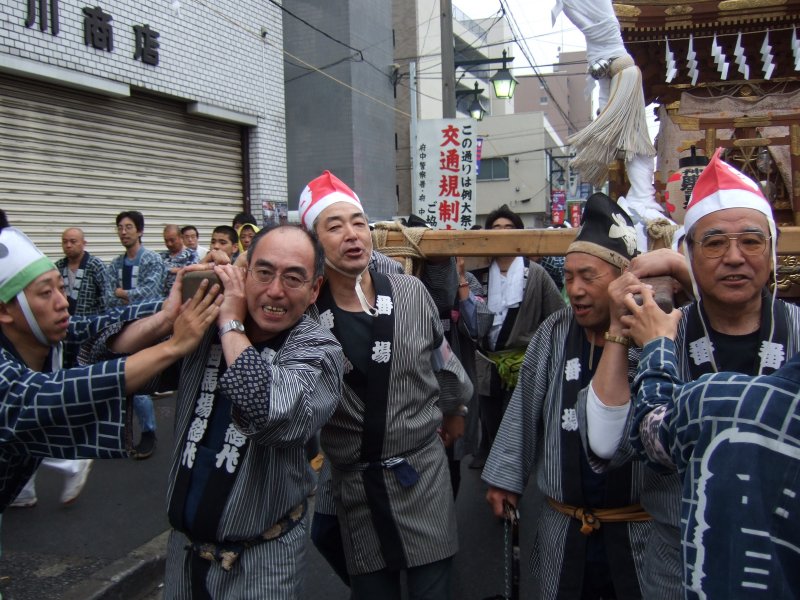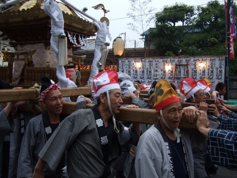 赤い烏帽子は還暦記念。40歳以上限定で担ぐ。