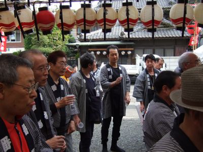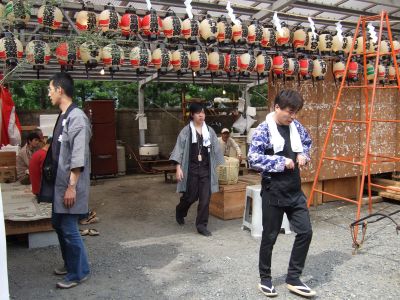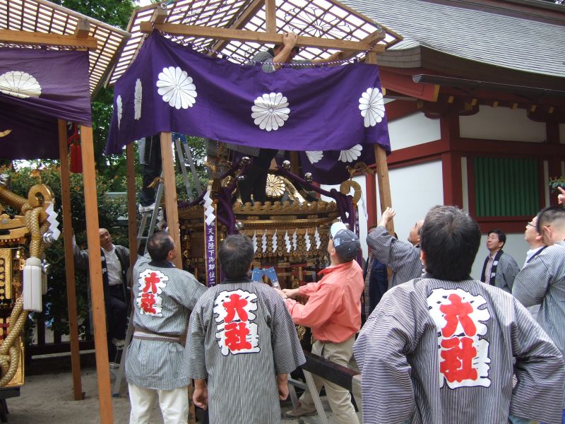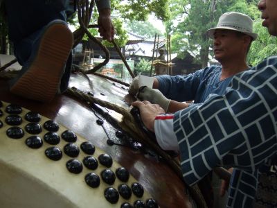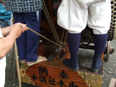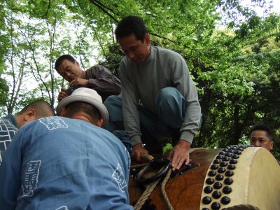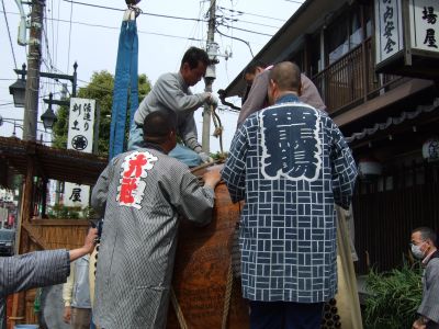 町内に運んだ太鼓は、いったん台車から降ろして飾ります。