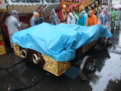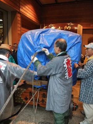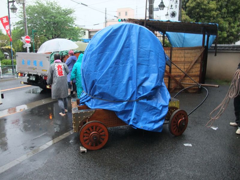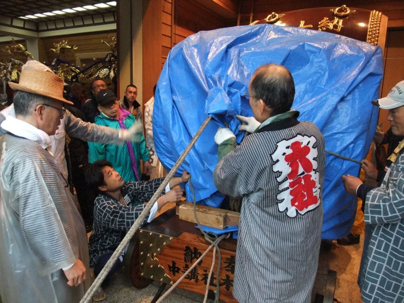 太鼓を台車に積み、ブルーシートで覆う。