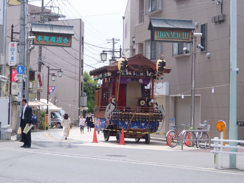 山車が欅並木に出発。