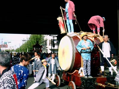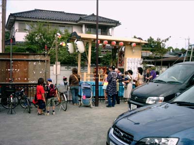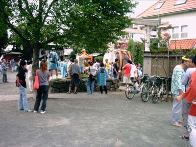 小野宮の拝殿と、出発を待つ神輿と太鼓。